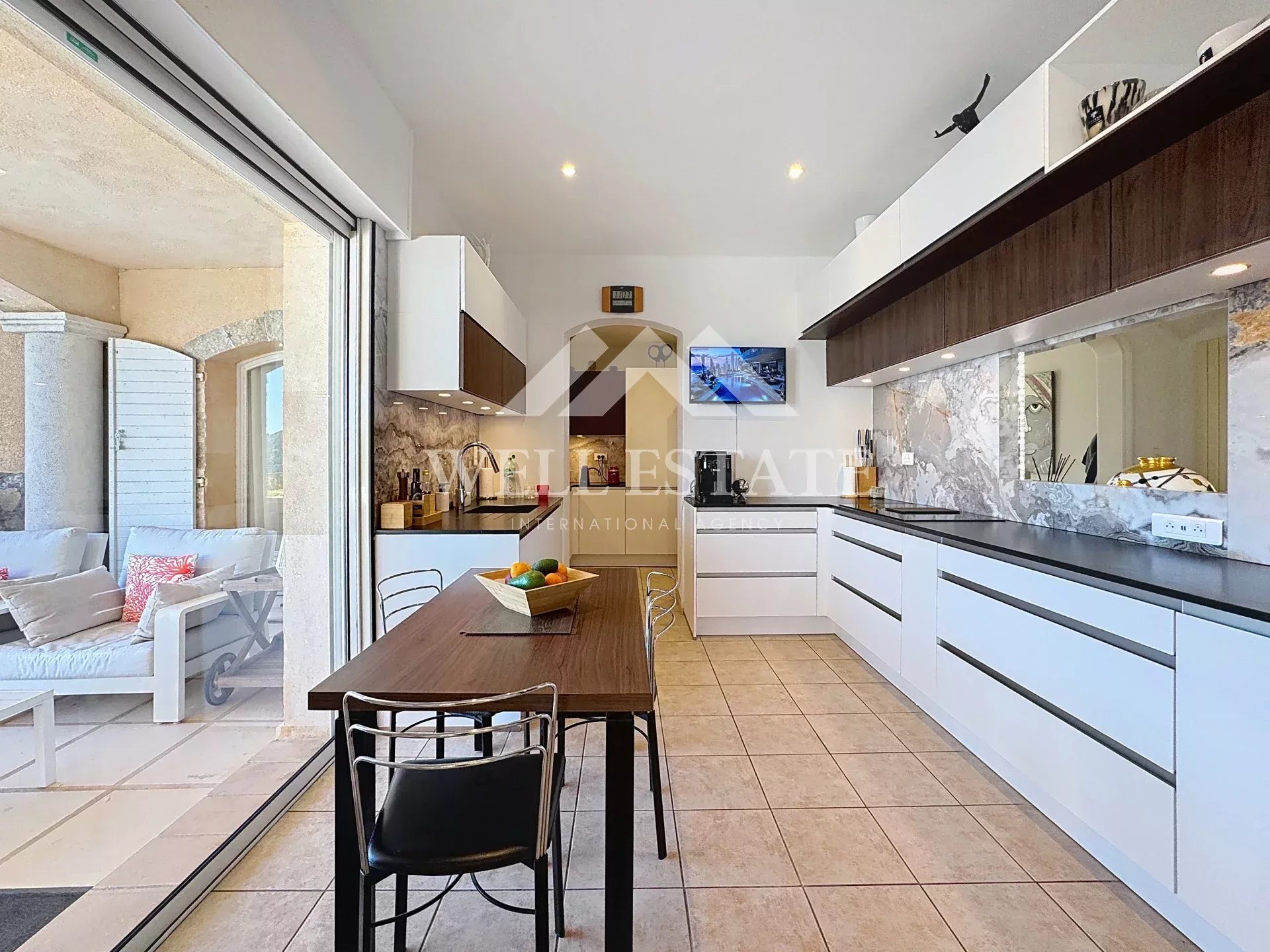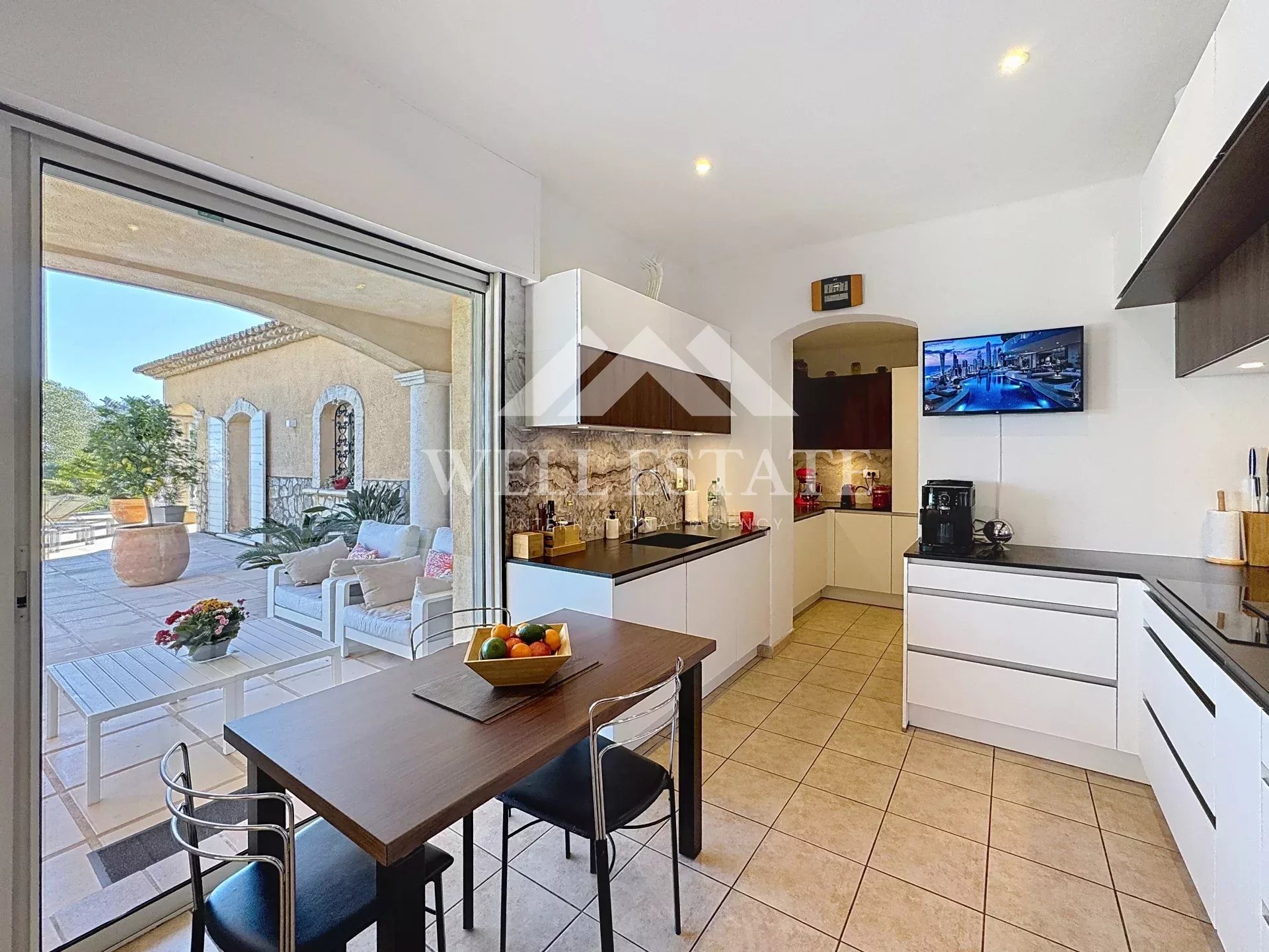 Elle s’ouvre sur un patio et un grand hall aux plafonds voûtés, suivi d’un double séjour de 72 m² avec cheminée, ouvrant largement sur les terrasses et la piscine. La cuisine indépendante, entièrement neuve et prolongée d’une arrière-cuisine, offre également un accès direct aux espaces extérieurs.